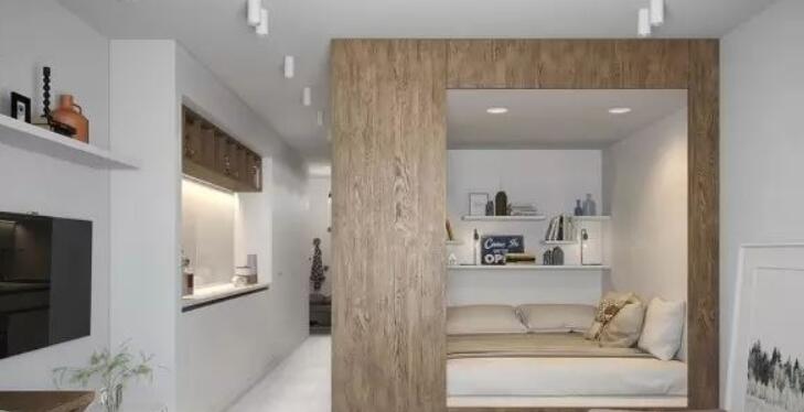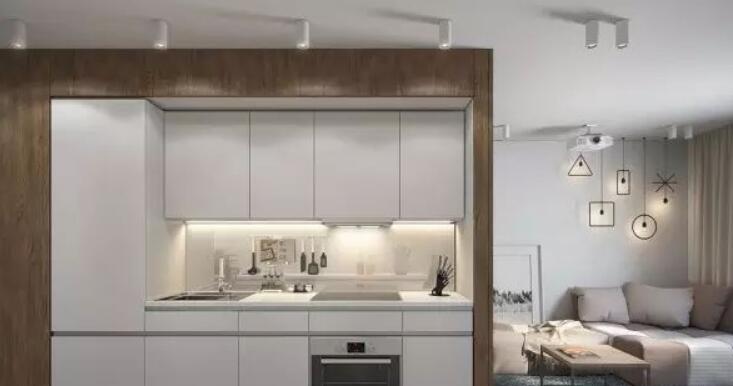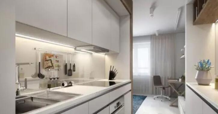 聪明的空间风格,使不同的生活空间,厨房,卧室没有妥协开放的感觉。从厨房到入口通道的走廊:一侧使用木材,另一侧是白色的橱柜,表示两侧不同的功能空间。