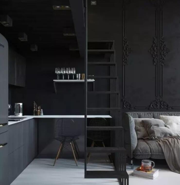 这个公寓的可用面积不到24平方米,设计师利用高挑的天花板,在垂直方向扩大生活空间而不是水平方向。设计时考虑到一个年轻的女人,享受舒适的黑暗风格和优雅的氛围。华丽的铜、黄铜、银器充满整个家。充足的镜子补他们的抛光金属的吸引力。入口通道采用高雅豪华的方法,光泽的门和粗糙表面形成一个强烈的对比。浴室风格和公寓保持一致,享受暗墙的大气,明亮的白色地板和天花板并不感到太沉闷。
